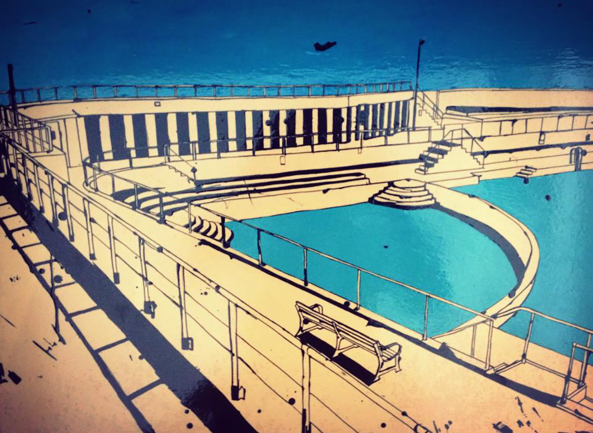 Drawing by artist Tracey Oldham of the Jubilee Pool walkways from the top terrace featuring the baby pool.
