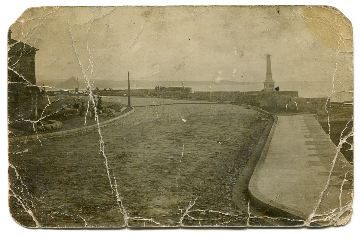 This photograph was taken from what we now think of as the Jubilee Pool end of Penzance Promenande, and it appears to show the building of the new Battery Road which opened in 1932. The houses on the left of the image were later demolished, making way for St Anthony's Gardens, built in 1933. In 1934 work began on the construction of the pool, changing the view shown on the right side of the image into something much more modern.