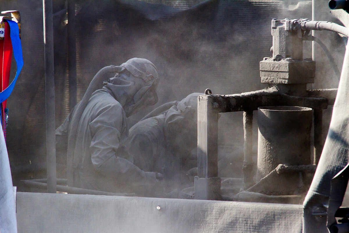 Breathing apparatus in use, not for underwater adventure but to enable Jubilee Pool to be restored to its full glory.