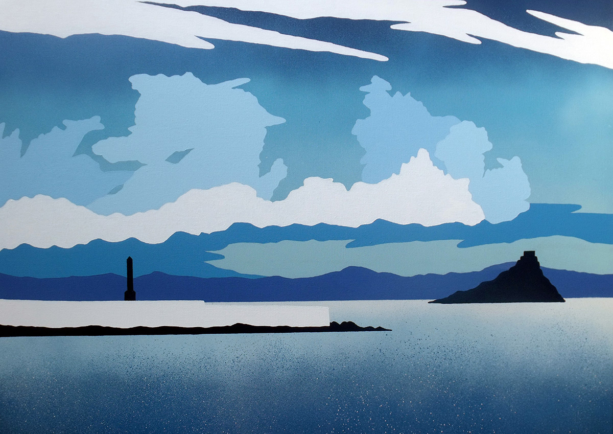 This image of Jubilee Pool nestled within Mount's Bay shows it in relation to St Michael's Mount and to the War Memorial that stands adjacent to the pool. It was created by Mat McIvor for a private commission using spray paint, acrylics and Posca pens on canvas.