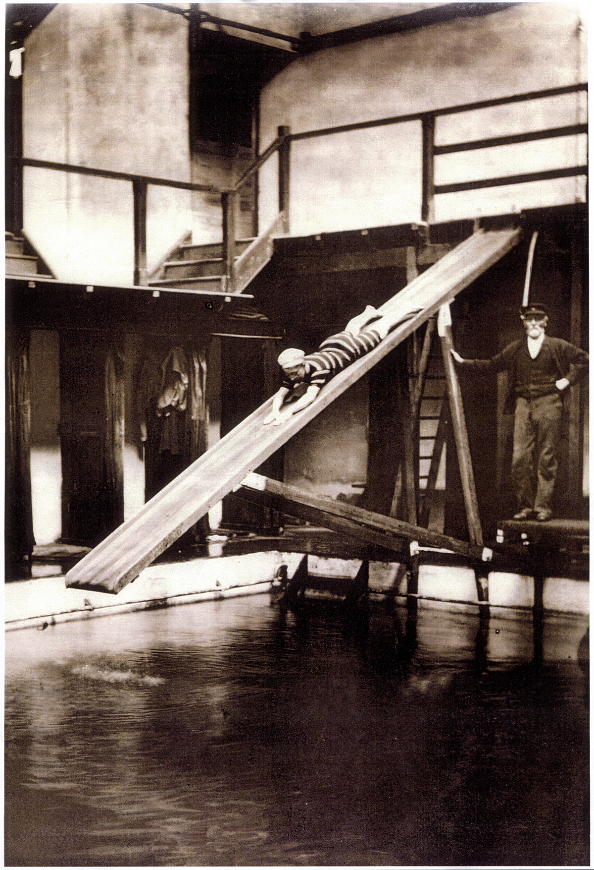 This image shows the interior of the old baths within the Café Marina, which stood on the Newlyn end of Penzance Promenade. On the right stands Omar Pascoe whose job at the baths included letting in fresh sea water when the tides were right. His son, also Omar Pascoe, was a stonemason who worked on St Anthony's Gardens, next to Jubilee Pool, and his great-granddaughter, Wendy Hosken, has been a keen swimmer all her life.