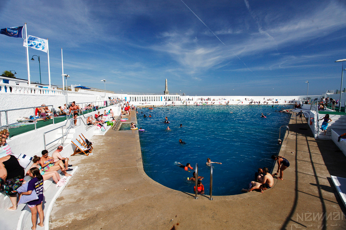 The flags show that it is a windy day, but visitors enjoy the shelter of Jubilee Pool's terraces.