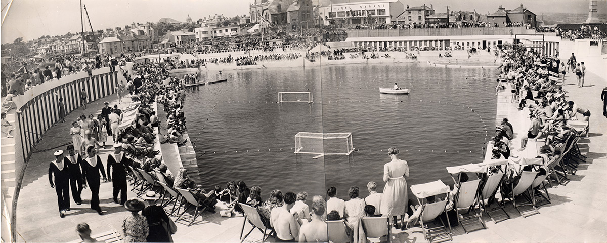 Spectators of this water polo match are stacked three tiers high in the background. This photo was probably taken in the summer of 1949 when the ships and crew of the Western Union Fleet visited Penzance.